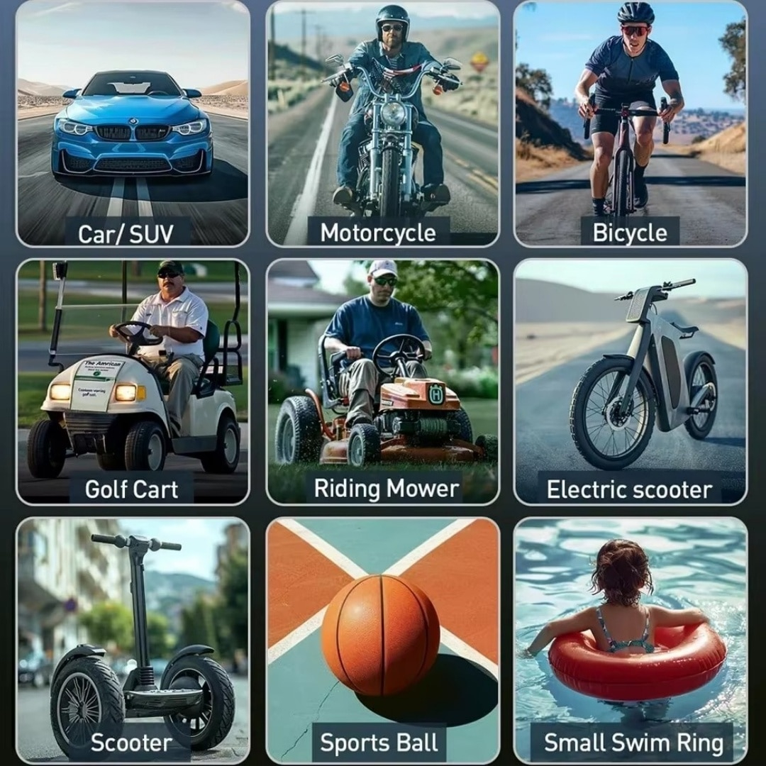 • Include accesorii (ace/adaptoare) pentru umflare: roți auto, motocicletă, bicicletă, mingi și baloane