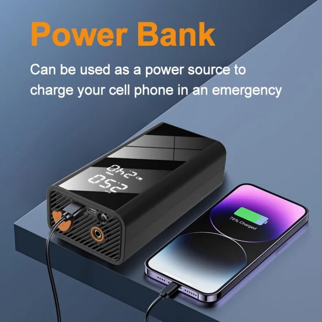 Dispozitiv compact 4 in 1, ideal pentru masina si situatii de urgenta: compresor de aer, starter auto, baterie externa si lanterna, toate intr-un singur aparat usor de transportat.
