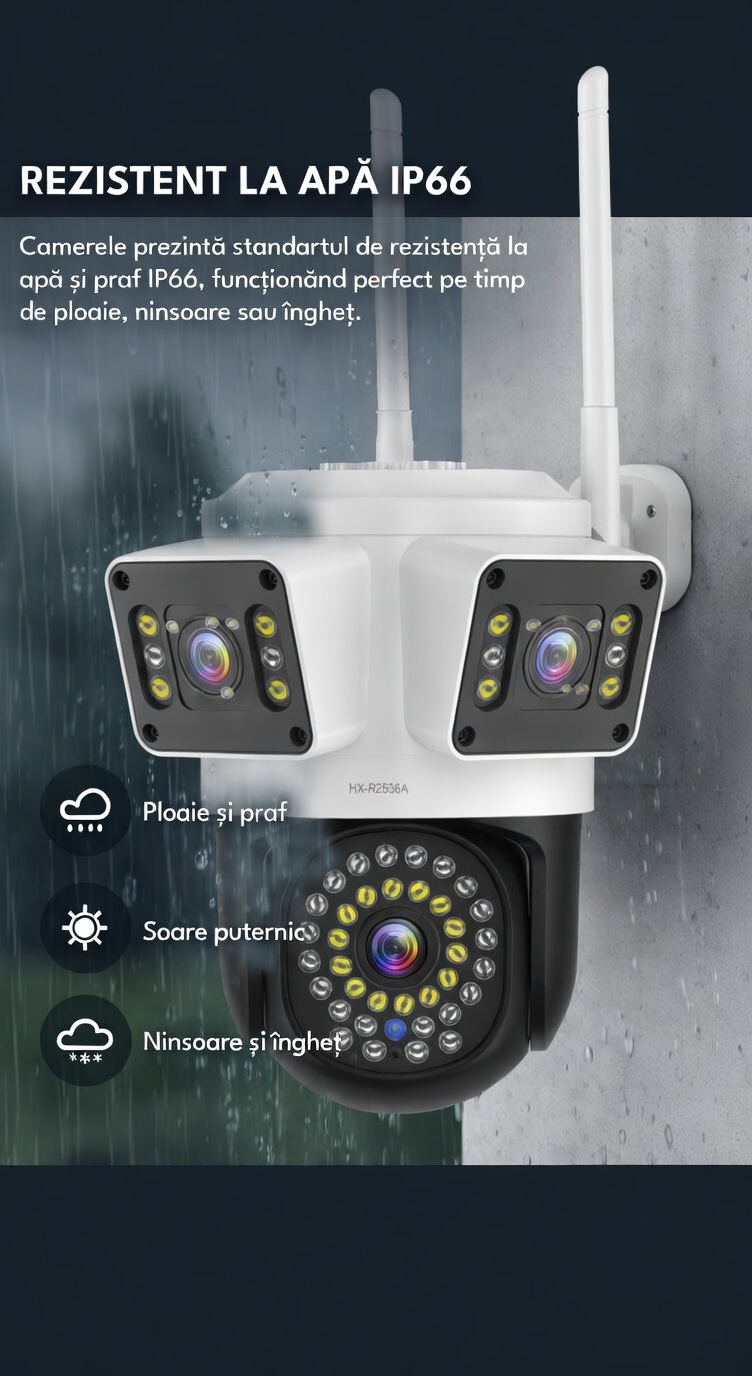 Tip camere: 3 lentile (1 rotativa 360° + 2 fixe)