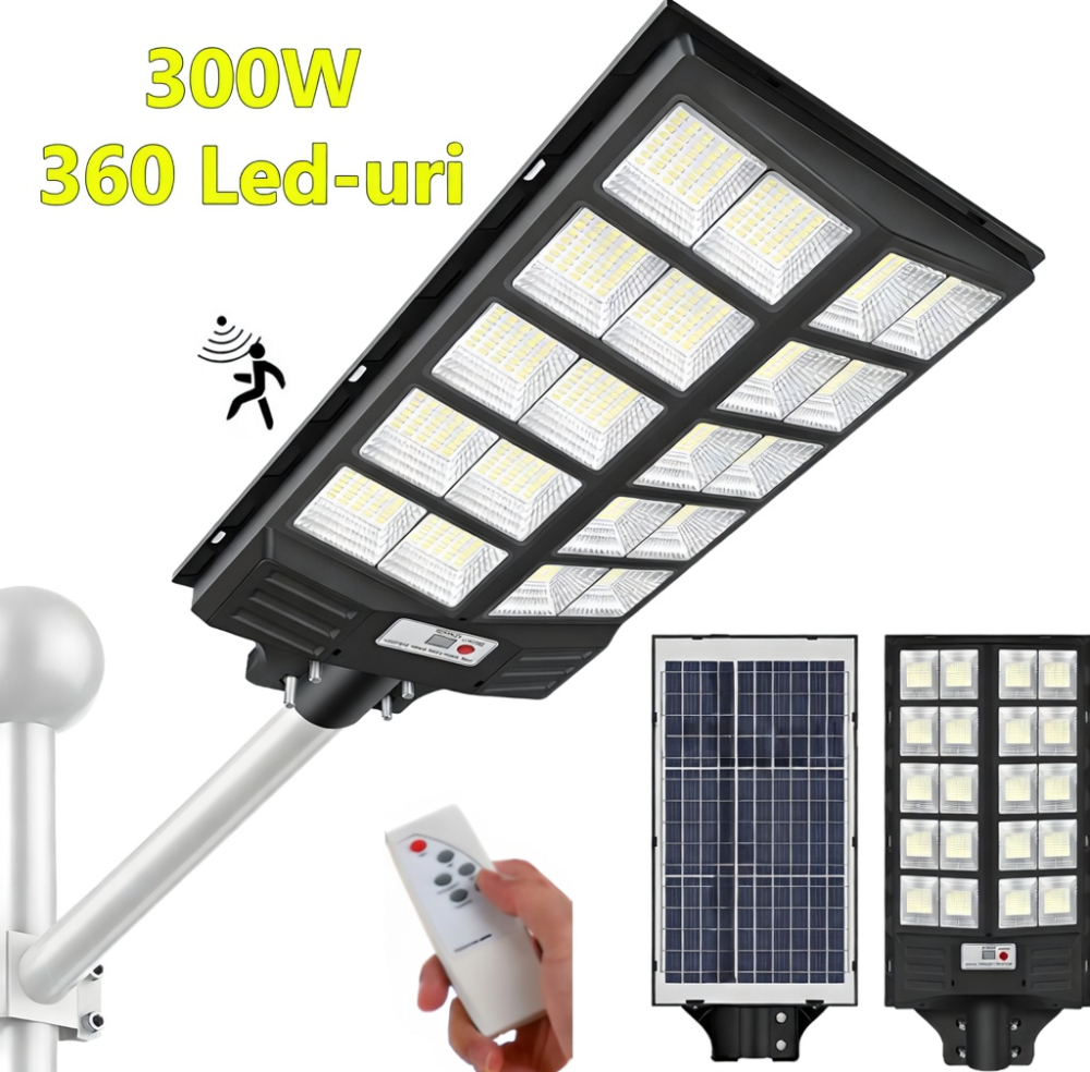 Ilumineaza eficient orice spatiu exterior cu aceasta lampa solara stradala puternica, dotata cu 360 LED-uri si panou solar integrat. Functioneaza complet independent de reteaua electrica, fiind ideala pentru curti, alei, parcari sau spatii comerciale.