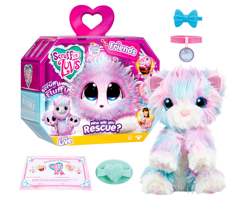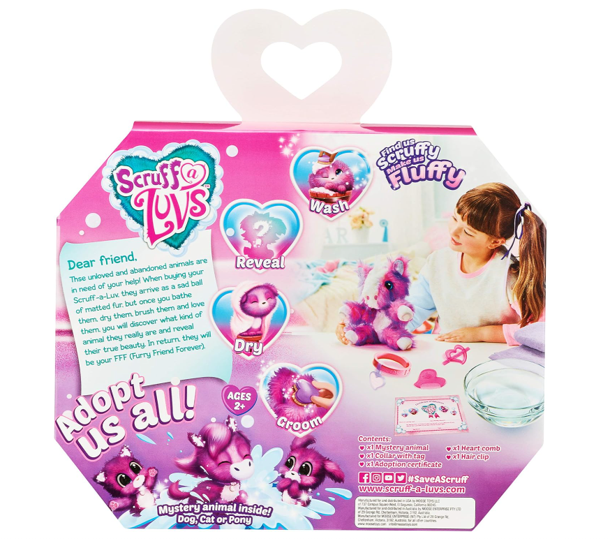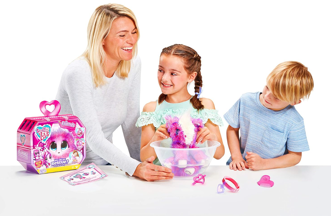 Descoperă magia salvării unui animăluț adorabil cu Scruff-a-Luvs Mystery Rescue Pet, o jucărie de plus interactivă surpriză care se transformă complet cu ajutorul iubirii și îngrijirii copilului. La început, animăluțul apare ca o minge de blăniță încâlcită și tristă, dar după spălare, uscare și îngrijire, se transformă într-un prieten de pluș colorat și fericit.