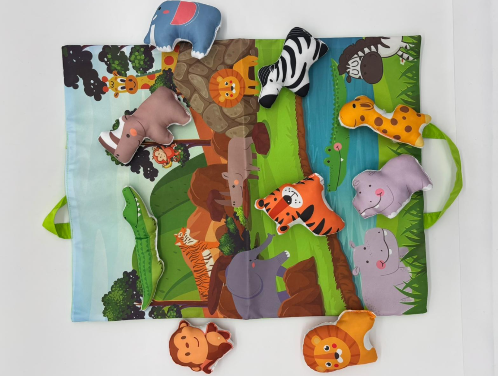 Copiii pot recunoaște animalele de pe covoraș, le pot potrivi cu figurinele corespunzătoare și pot învăța despre animalele sălbatice și mediul lor natural. Figurinele au o textură plăcută la atingere, fiind sigure și ușor de manevrat.