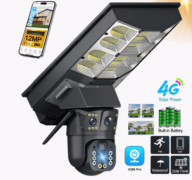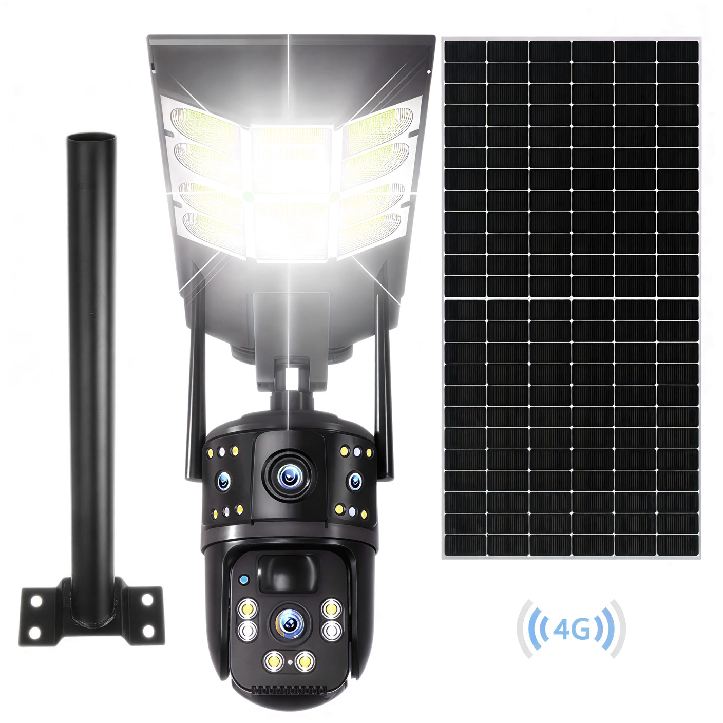 Cameră de Supraveghere Solară 4G cu Lampă Integrată, Sistem 5-în-1, 4 Lentile, Rotire 360°, Detecție Mișcare, Viziune Nocturnă IR & Color, Audio Bidirecțional, IP67, Panou Solar, Monitorizare Live
