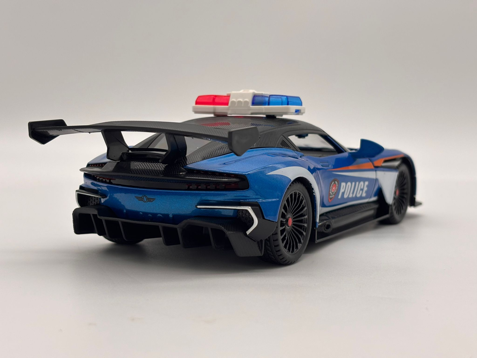 Automachetă Aston Martin Valkyrie în variantă Poliție, realizată din metal, cu detalii realiste și funcții interactive. Modelul dispune de uși deschizătoare, sunete și lumini activate prin apăsarea caroseriei, precum și funcție Pull-Back, pentru deplasare automată după retragerea înapoi.