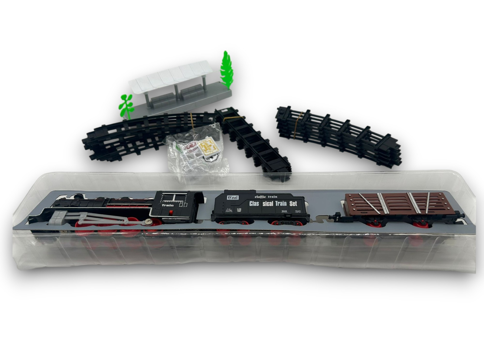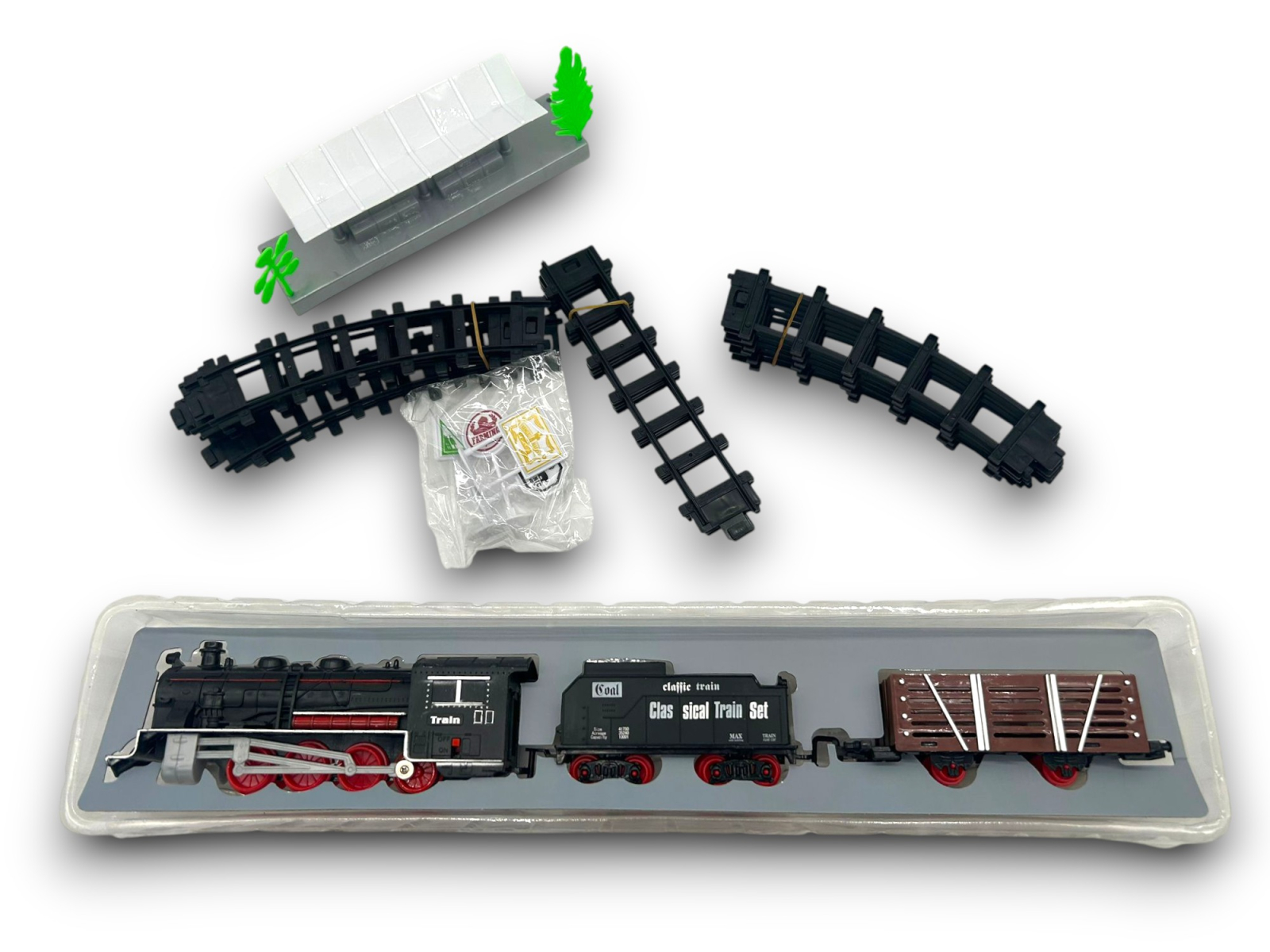 Setul include locomotiva, 2 vagoane, gara, șine și semne de trafic feroviar, toate ușor de asamblat. Perfect pentru copii, dar și pentru colecționarii pasionați de trenuri clasice.